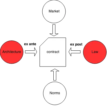 在Lessig的最初版本中,是一个人位于信息图的中间,不是一个合约。这位了不起的思考者用他的信息图,努力教给我们这些凡人的是,有四种最基本的约束影响着一个人的一生。这四个约束本质上截然不同的,但是以复杂的方式交织在一起。