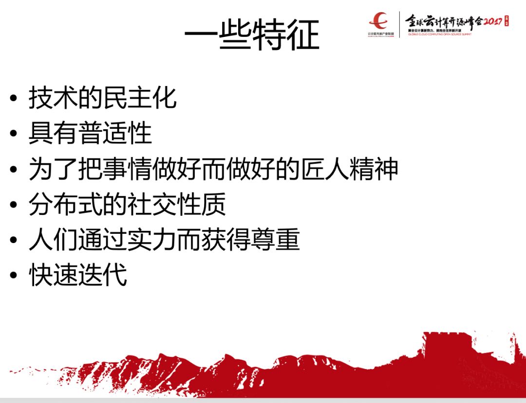 最后总结一些特征,首先是技术的民主化,它具有普适性。即使有一部分是为了钱,但是大部分还是通过兴趣去做这件事情,而且我一定要把这个东西解决好,为了把事情做好而做好的这种匠人精神,这个在开源里面是非常非常难得的。我们这个世界很多都是因为这样的人去改变的,还有完全是分布式的,获得尊重完全是靠实力,而不是一个抬头。早发布、快速迭代、快速淘汰,开源项目 95% 以上是失败的。