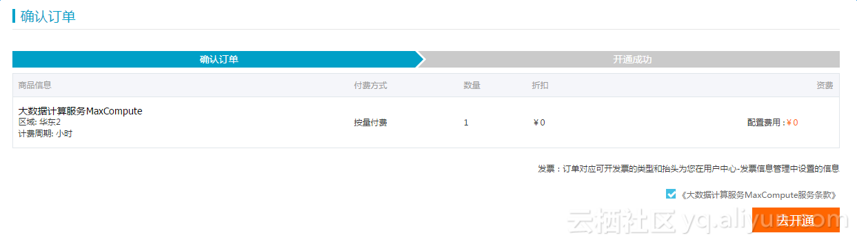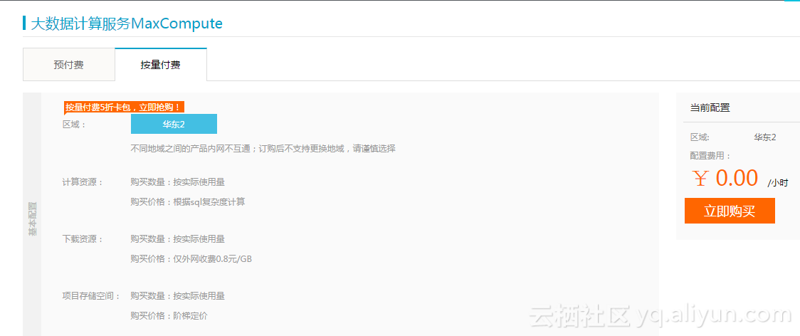 阿里云实名认证账号访问www.aliyun.com/product/odp… ,开通 MaxCompute,选择按量付费进行购买。