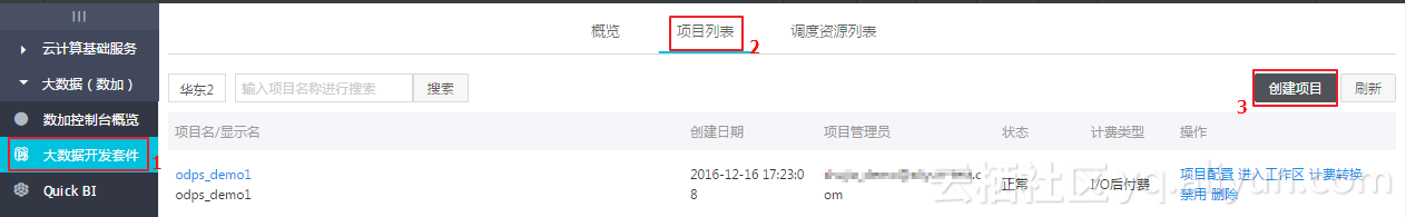 进入控制台页面后导航至“大数据开发套件->项目列表“,点击”创建项目”,如图所示:
