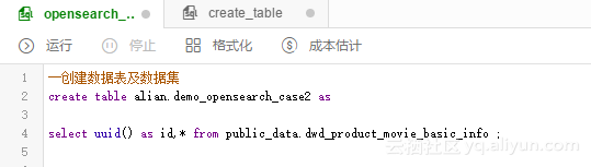 拷贝一份数据到自己的Project项目下,注意:OpenSearch里有主键概念,所以我们需要在MaxCompute中建主键,这里通过UUID函数实现。