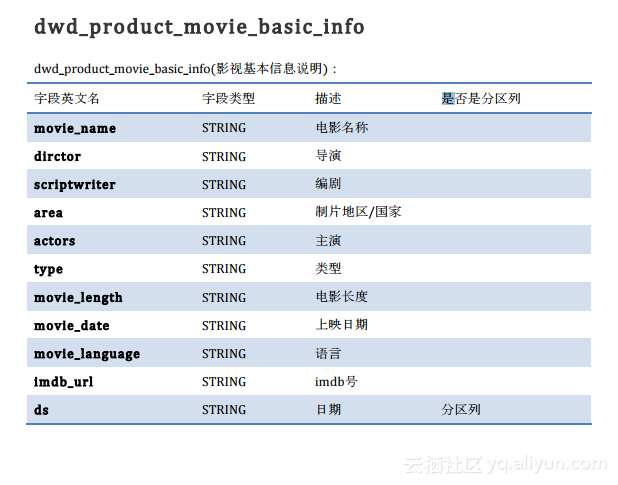 数据说明:笔者这里引用了一份MaxCompute公开数据集(正在公测),地址:https://yq.aliyun.com/articles/89763,目前MaxCompute开放的数据类别包括:股票价格数据,房产信息,影视及其票房数据。所有的数据均被存储在 MaxCompute 产品中的 public_data 项目中。