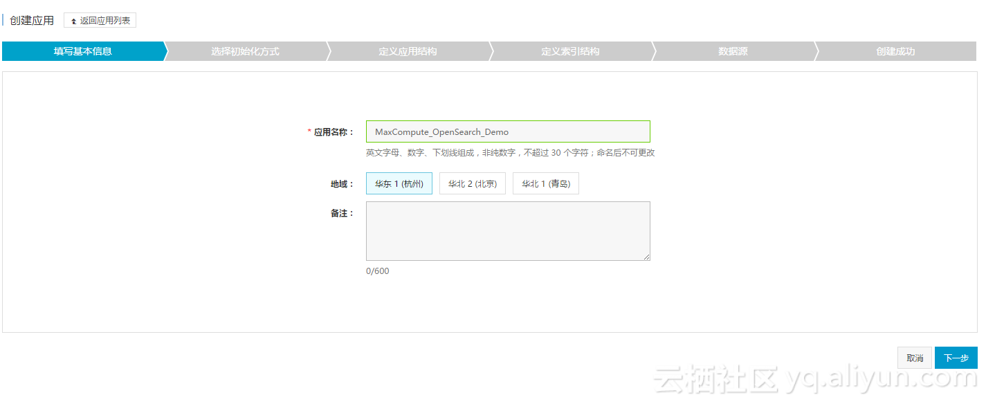 3.3 输入应用名称MaxCompute_OpenSearch_Demo,地域选华东1(杭州),因为MaxCompute目前只有华东,否则数据链路不通,点击下一步。