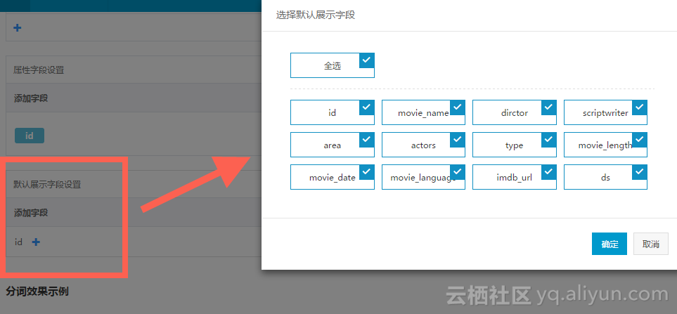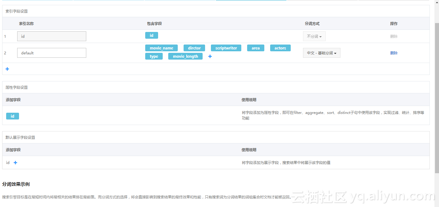 选择movie_name、 director、scriptwriter、area、actors、type、movile_date、movie_language字段做索引,设置默认中文分词方式。