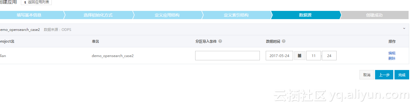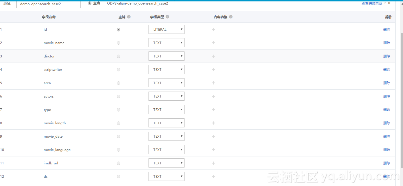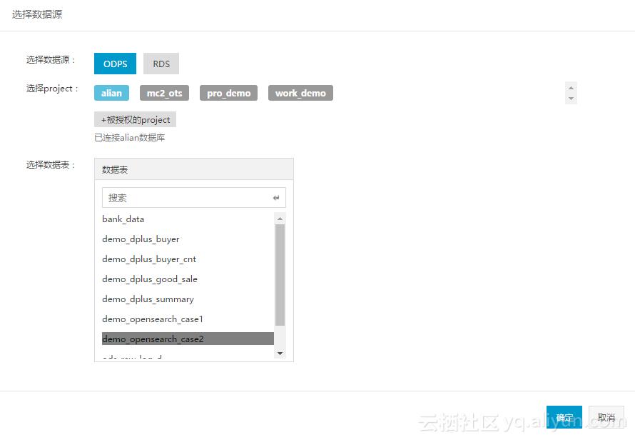 选择刚才创建的ODPS项目及表demo_opensearch_case2