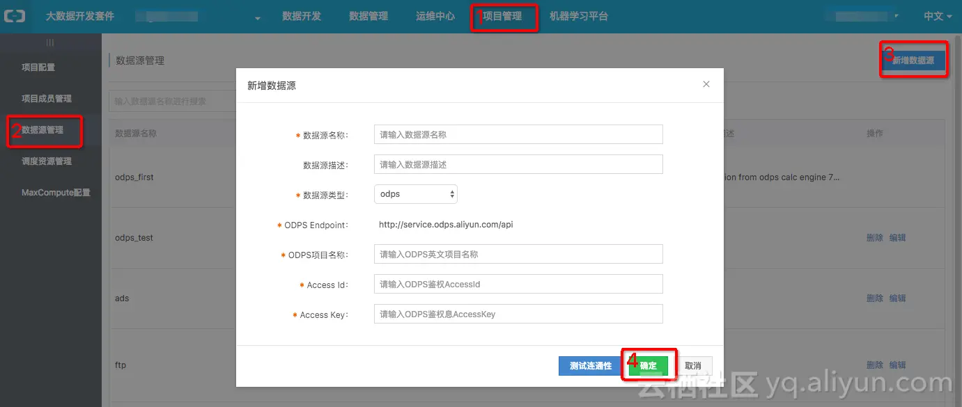 1、在其中一个MaxCompute项目空间项目管理中添加数据源,该数据源为另一个云账号的MaxCompute项目空间。