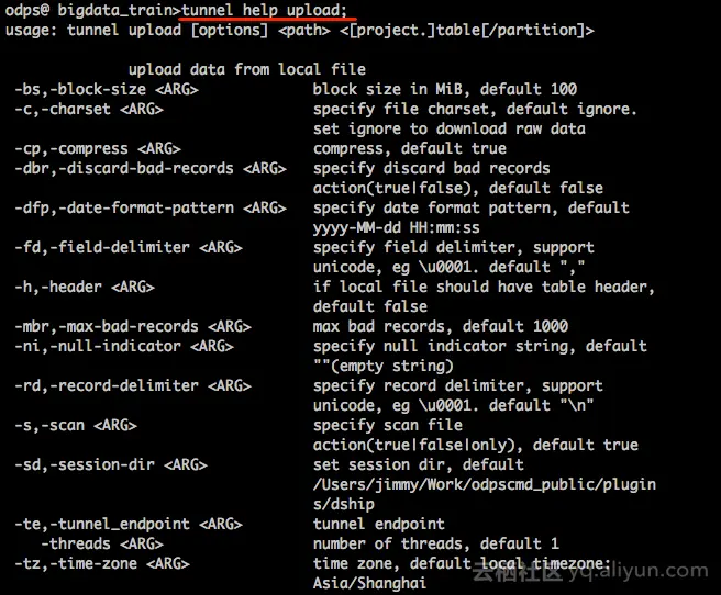 4、通过ODPS CLT中的tunnel命令实现数据的导入。命令参考: