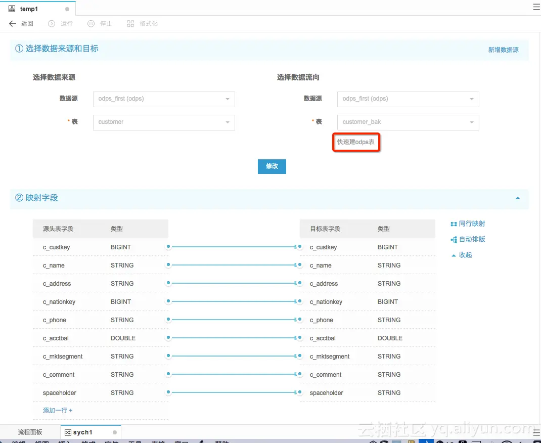2、在DataIDE数据开发中新建“数据同步”任务,如果目标数据源中表还不存在,可以点击“快速建ODPS表”,配置字段映射等。