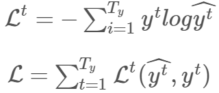 如前所述,字符级语言模型的目标是最小化训练序列的负对数似然。因此,时间步 (t) 的损失函数和所有时间步的总损失为: