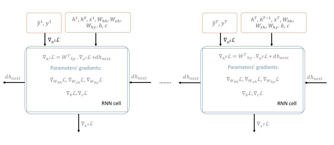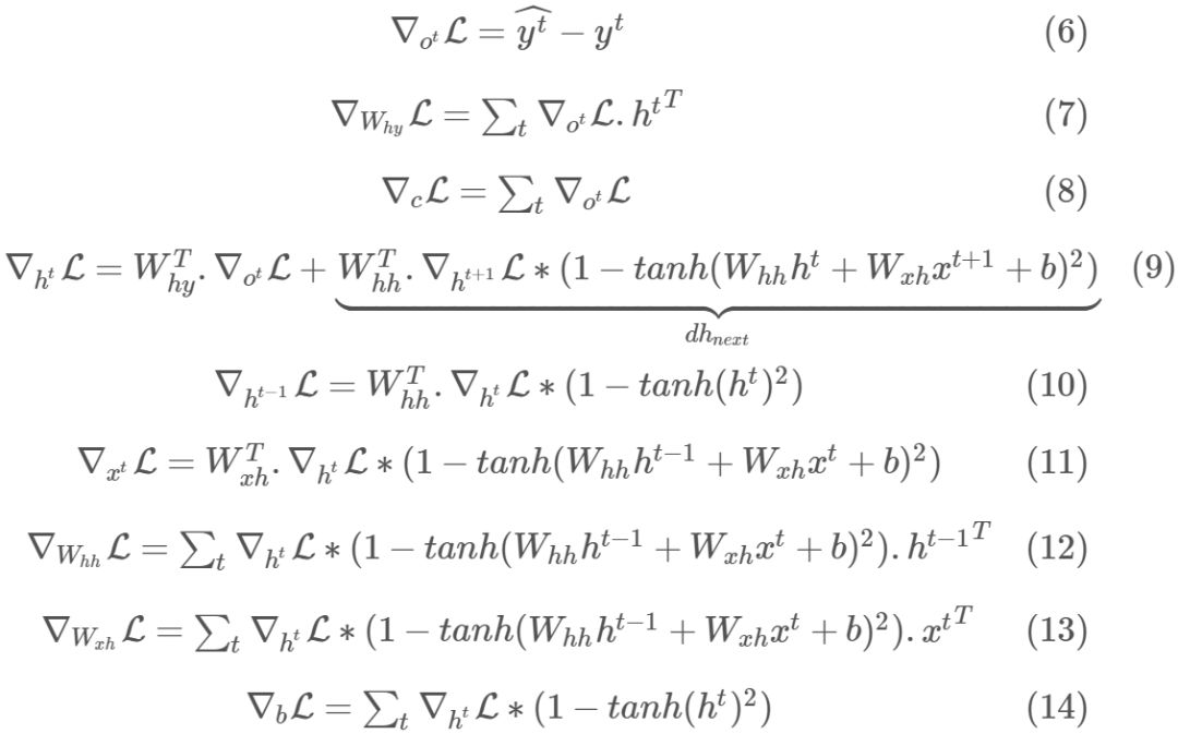 此外,由于已知 RNN 有很陡峭的梯度变化,梯度可能会突然变得非常大然后使原来训练得到的进展功亏一篑,即使使用了适应性学习方法如 RMSProp。其原因是梯度是损失函数的线性近似,可能无法捕捉在评估的点之外的其它信息,例如损失曲面的曲率。因此,通常在实践中会将梯度限制在 [-maxValue, maxValue] 区间内。在这里,我们将把梯度限制在 [-5,5] 上。这意味着如果梯度小于-5 或者大于 5,它将分别被截断为-5 和 5。以下是所有时间步上用于计算损失函数对所有参数的梯度所需的公式。