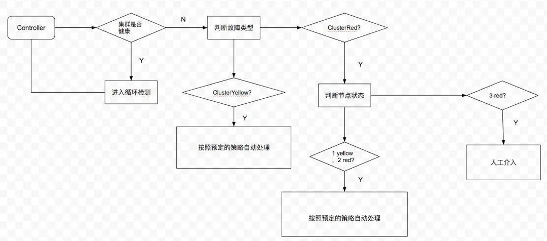 Controller 收集到所有 MySQL 节点状态后,会根据这些节点的状态推算 MySQL 集群的状态。当检测到 MySQL 集群状态不是 Green 时,会触发「故障处理」逻辑,该逻辑会根据已知的故障处理方案进行处理。若该故障类型未知,人工介入处理。整个流程如下图: