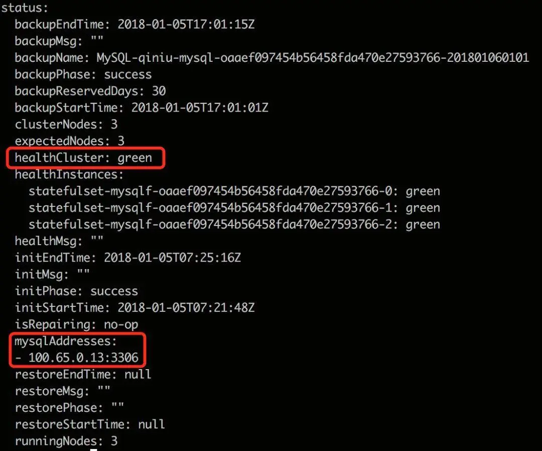 在集群创建好后,用户可通过该 CR object 的 status 字段获取集群状态: