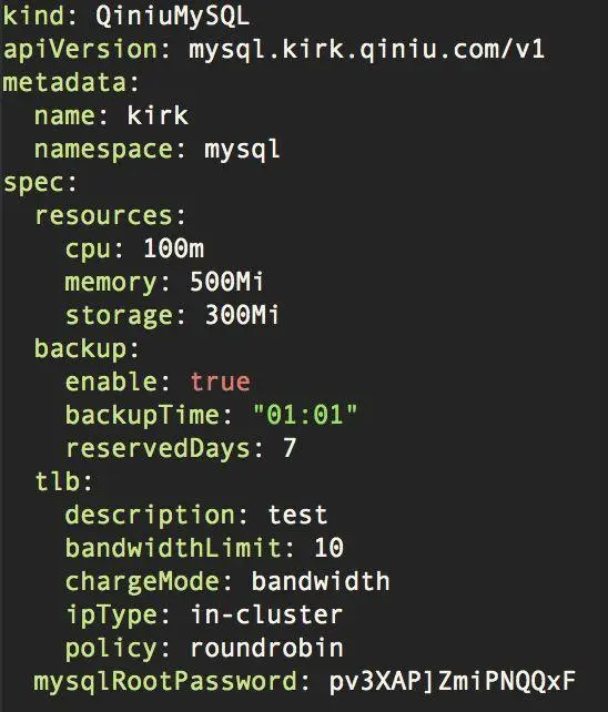 我们基于 Operator 的理念实现了高可靠的 MySQL 服务,为用户定义了两类资源,即 QiniuMySQL 和 QiniuMySQLData。前者描述用户对 MySQL 集群的配置,后者描述手动备份/恢复数据的任务,这里以 QiniuMySQL 为例。