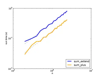 我写了三个连接列表的函数:sum_plus使用+=;sum_extend使用list.extend;sum_sum使用sum。 我在n的范围内对它们计时,并将结果绘制在双对数刻度上。 下图展示了结果。