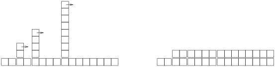 重新哈希的额外工作,表现为一系列不断增高的高塔,各自之间的距离越来越大。 现在,如果你打翻这些塔,将大小调整的代价均摊到所有的 add 上,你会从图上看到 n 次 add 的整个花费是 2n - 2 。