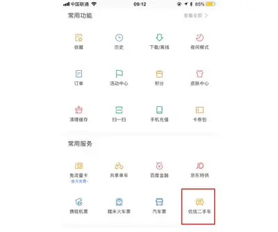 在百度APP底栏选择「我的」,从「常用服务」中可以点击进入「优信二手车」百度小程序