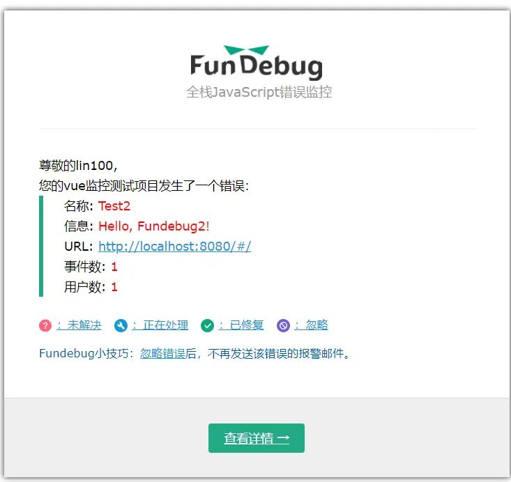 引入[fundebug]对线上项目进行异常监控和警报,开发人员能够更加快速的锁定线上问题,保证生产环境的安全和稳定。