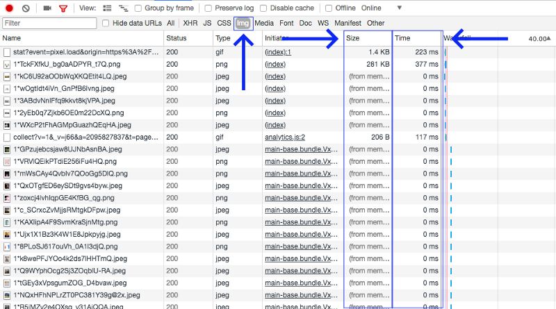 这三个部分都属于图片优化这一类。你可以在Network标签中通过筛选IMG来获取实际加载了哪些图片以及它们的体积大小。现在只看Size和 Time这两列的数据,看看你是否满意这样的结果。目前还没有普适的标准规定每个文件应该有多大,这完全依赖于客户端设备种类、客户群体和其他你能想到的所有因素。
