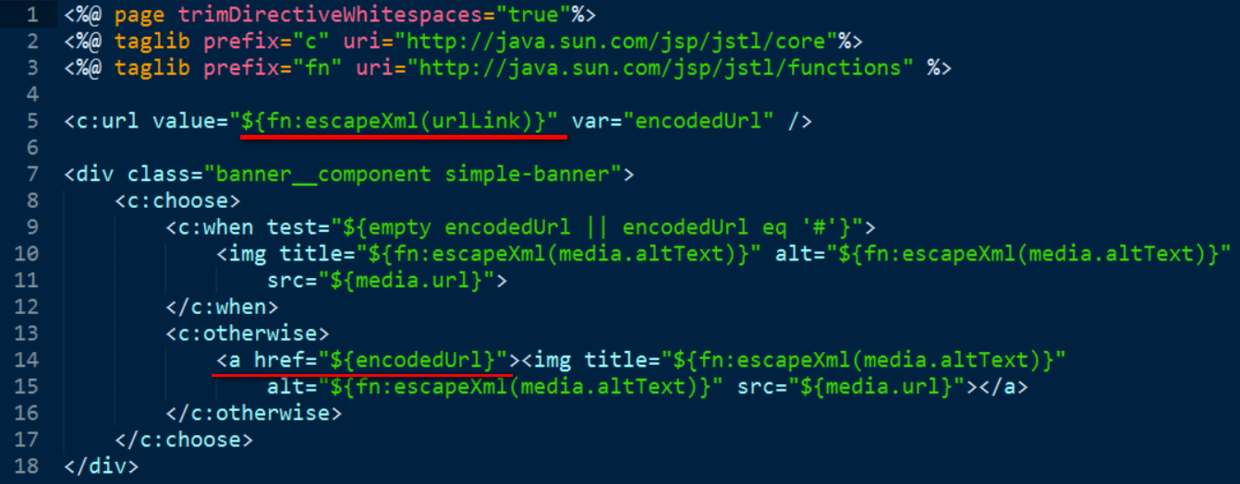 注意看第14行的a标签, 该标签就是最后用户在浏览器里看到的超链接。其href的值来自JSP模型的属性urlLink(在下图第5行指定)。