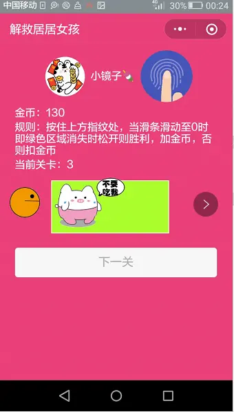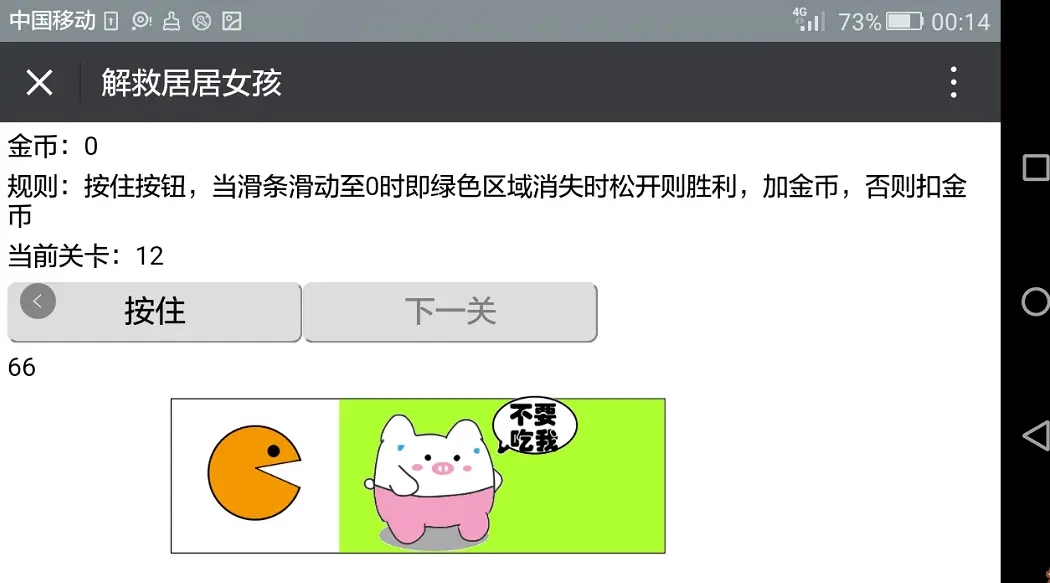 规则:游戏的玩法如图,按住按钮不放,绿色滑块、猪猪和怪兽会开始跑起来,当滑块减为0时松开即为胜利,若提前或者延后都属失败。越往后面的关卡速度越快,金币数获取和扣除相应变多。