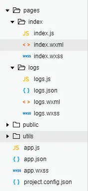 pages文件夹存放的是程序的所有页面。例如这个项目中有index页面和logs页面,每个页面都可以由四个文件构成:js、json、wxml、wxss。js文件负责该页面的逻辑交互,json文件是对该页面的配置,wxml是页面的结构、wxss是页面的样式。