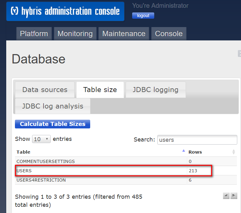 Hybris Administration console里可以查看每个DB table有多少条记录: