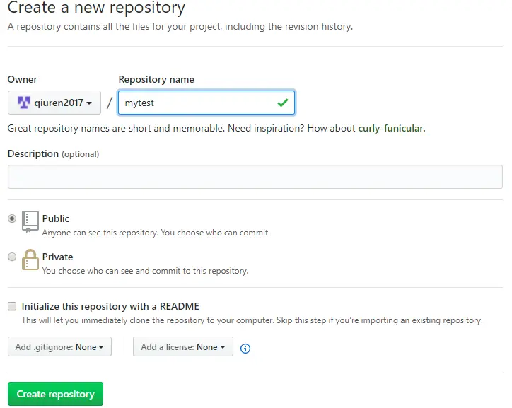 git remote add origin git@github.com:qiuren2017/mytest.git 注意:qiuren2017为账号名称,mytest为我的测试项目。