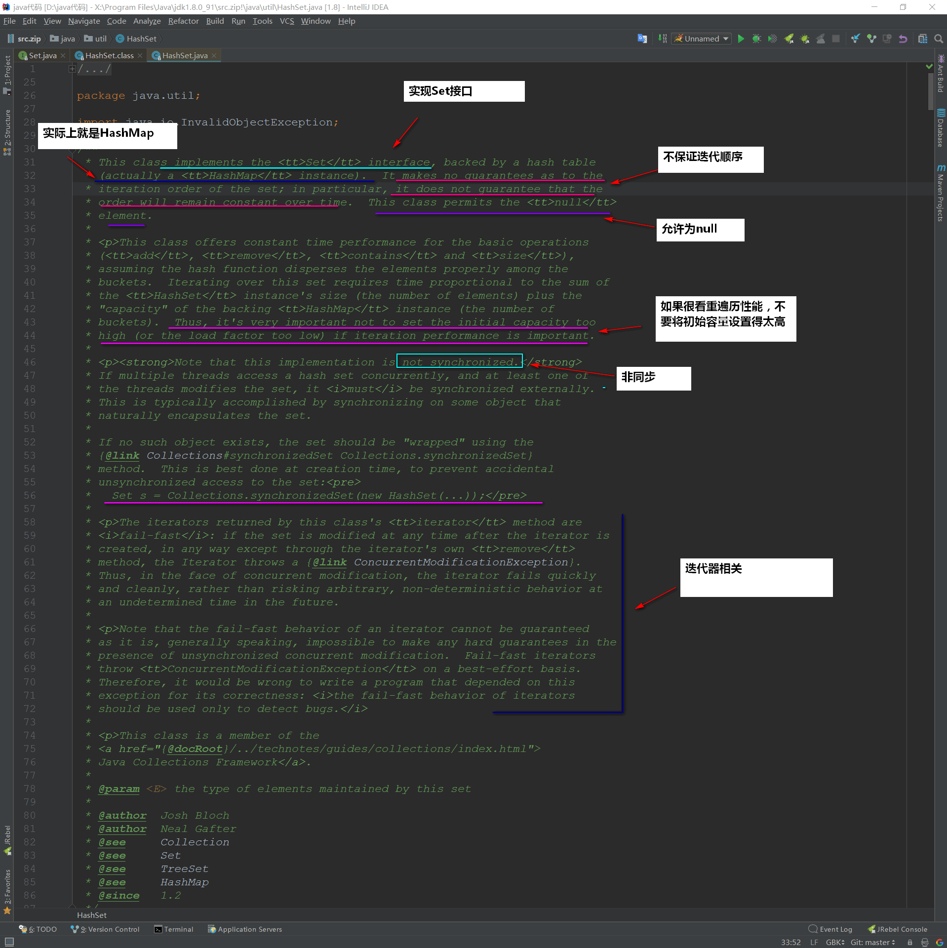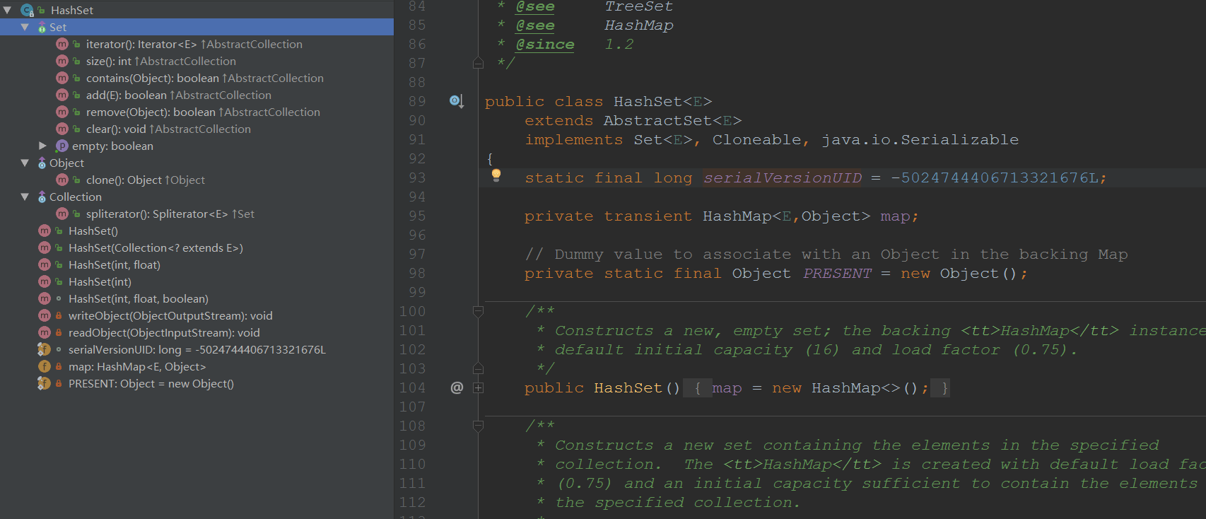从顶部注释来看,我们就可以归纳HashSet的要点了: