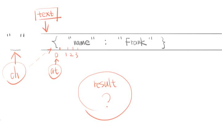 ch=" ",at=0, text='{ "name" : "Frank" }'- 吃一个空格。由于 ch 一开始的默认值是空格,所以这个空格就被吃掉了,然后 ch 指向text 的第一个字符,at 指向 ch 后面一个字符(存下标,也就是1)。