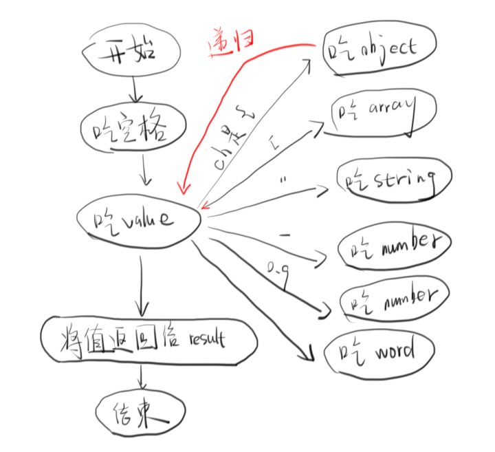 {,就说明这是一个对象,生成一个空对象 object 用来存储 key 和 value。而且后面的字符就要按照对象的语法来吃。 - 吃空格直到遇到非空格。理论上