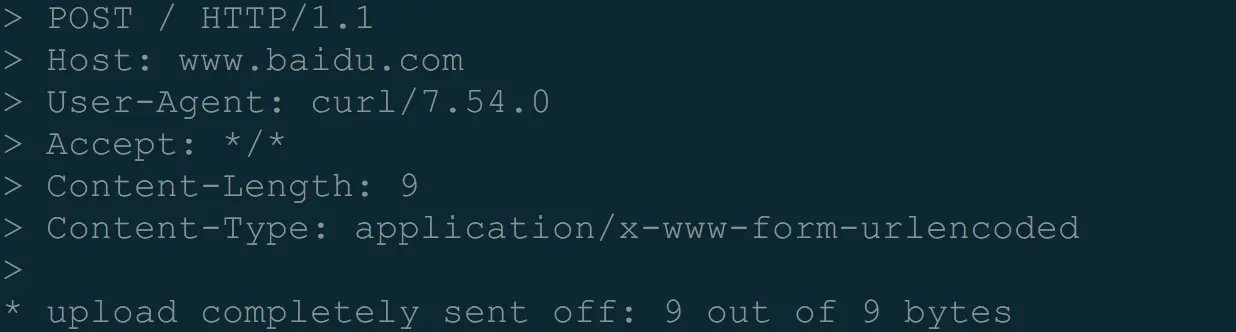 curl -X POST -d "123456789" -s -v -H -- "https://www.baidu.com"
