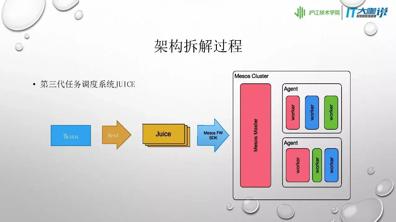 我们在第三代任务调度系统中引入了些中间件。Mesos是我们引入的第一个中间件,它专门用于做资源调度,主要是帮我们调度worker。只要通过API告诉Mesos通过什么策略来分配worker,Mesos就会自动在集群内寻找合适的资源启动任务。通过这套系统,我们不仅能完成现有业务任务,还可以扩展给其他任务型业务使用。