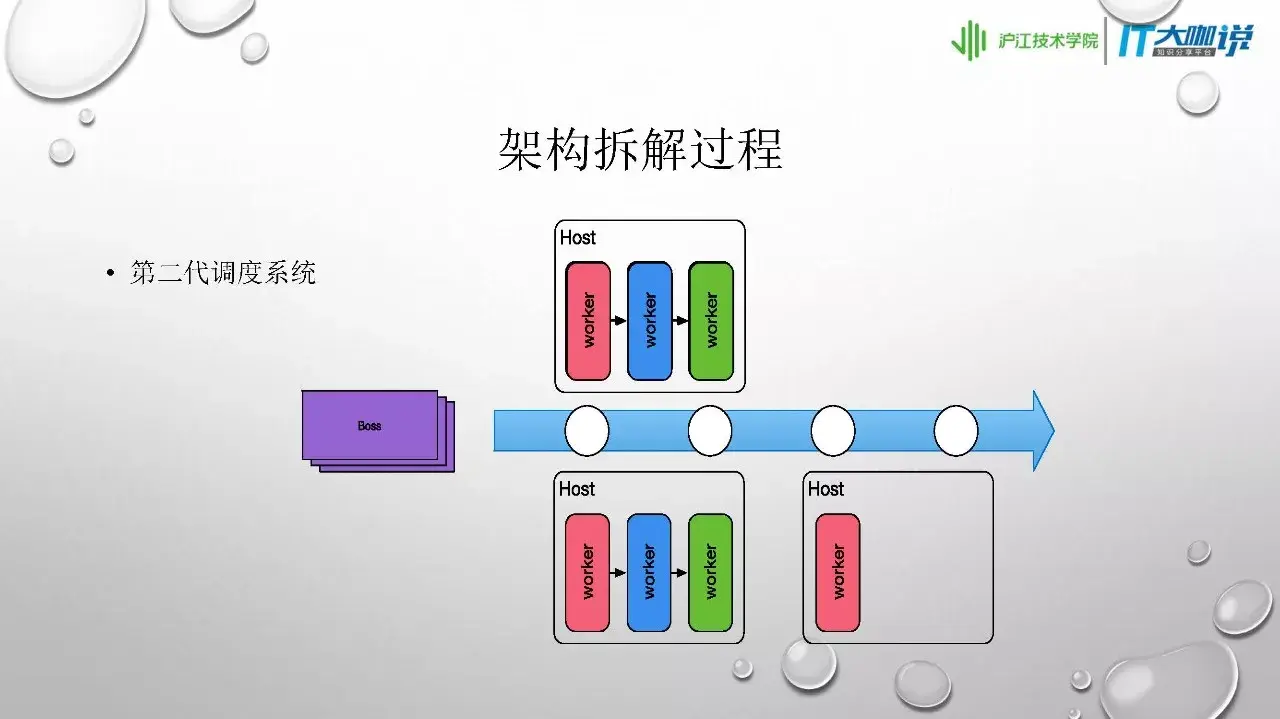 首先我们做了业务拆分。我们把业务理解成一个工厂的流水线,有一个“Boss”专门负责接任务,然后把任务发到流水线上。Worker们从流水线上拿一个合适的任务去做,第一个worker完成后交还给流水线,下一个worker再去流水线上找合适的任务做。每一个worker都对应一个不同的DB进行存储它的状态信息,boss也有DB存储自己的状态信息,这两种DB是分开的。