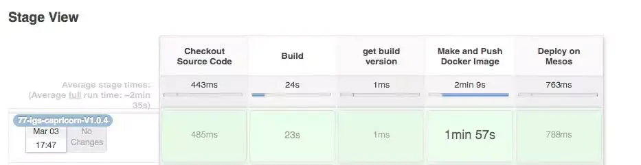 构建PIPELINE:Pipeline是Jenkins2推荐的自动化构建方式,微服务可以用其他的方式实现自动化,只是用Pipeline能更清晰的知道每一步在干什么。下图是沪江微服务发布的一个Pipeline截图。
