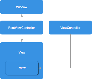 UIWindow 作为一个应用程序的根视图(root view),是旋转和初始布局消息等事件产生的来源。在上图中,child view controller 的 view 插入到 root view controller 的视图层级中,被排除在这些事件之外了。View 事件方法诸如 viewWillAppear: 将不会被调用。