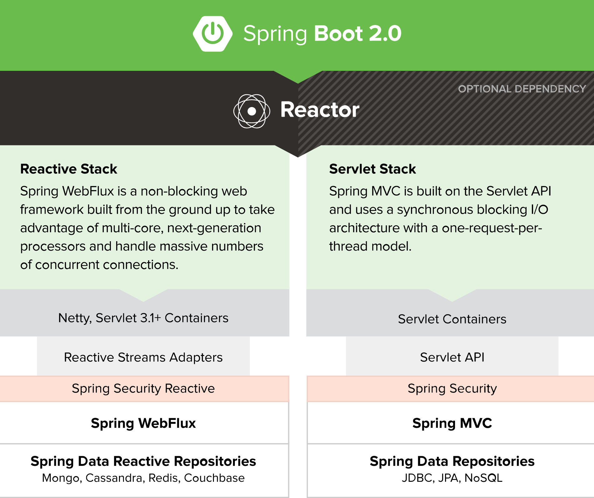 Spring Boot Webflux 就是基于 Reactor 实现的。Spring Boot 2.0 包括一个新的 spring-webflux 模块。该模块包含对响应式 HTTP 和 WebSocket 客户端的支持,以及对 REST,HTML 和 WebSocket 交互等程序的支持。一般来说,Spring MVC 用于同步处理,Spring Webflux 用于异步处理。