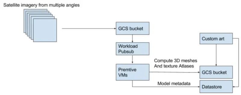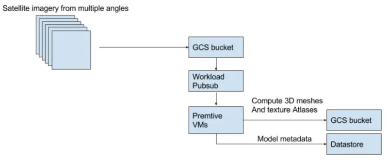 另外,我们还要生成工作信息并将 work token 推送到 pub/sub。我们有一批抢占式虚拟机,负责收集这些 pub/sub 请求,并开始制作 3D 网格和纹理图集。最终的结果也被推送到 GCS bucket 里面。
