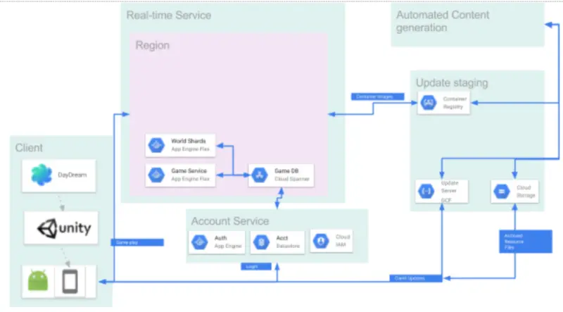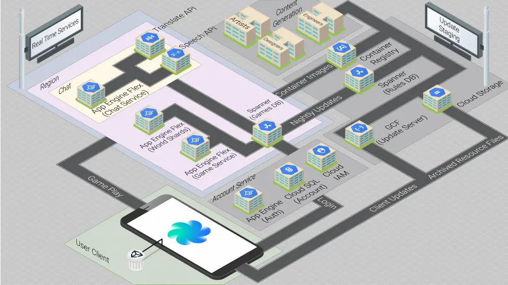 为此,你可以利用一组名为 『World Shards』 的 App Engine Flex 组件,它们允许地理上比较接近的客户端连接并交换位置和移动信息数据。因此,当用户进入游戏区域时,我们会计算出他们最近的区域,并将它们直接连接到适当的 World Shards。