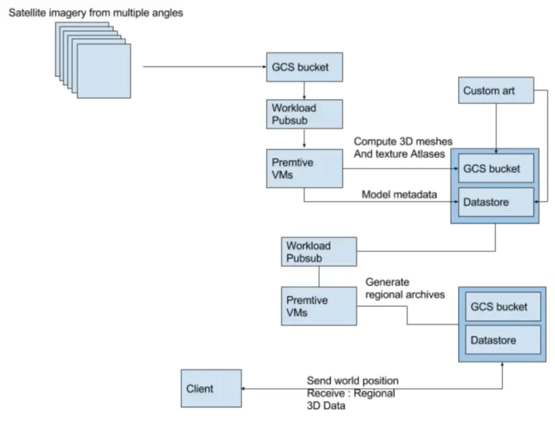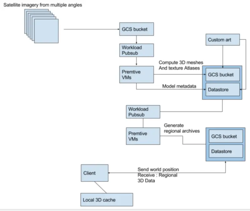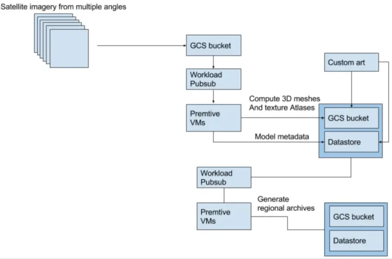 要计算这一点,需要使用与生成 3D 网格相同的离线构建过程;具体来说,你可以为 pub/sub 生成一堆任务,并使用一群抢占式虚拟机来计算和合并适当的区域 blob。