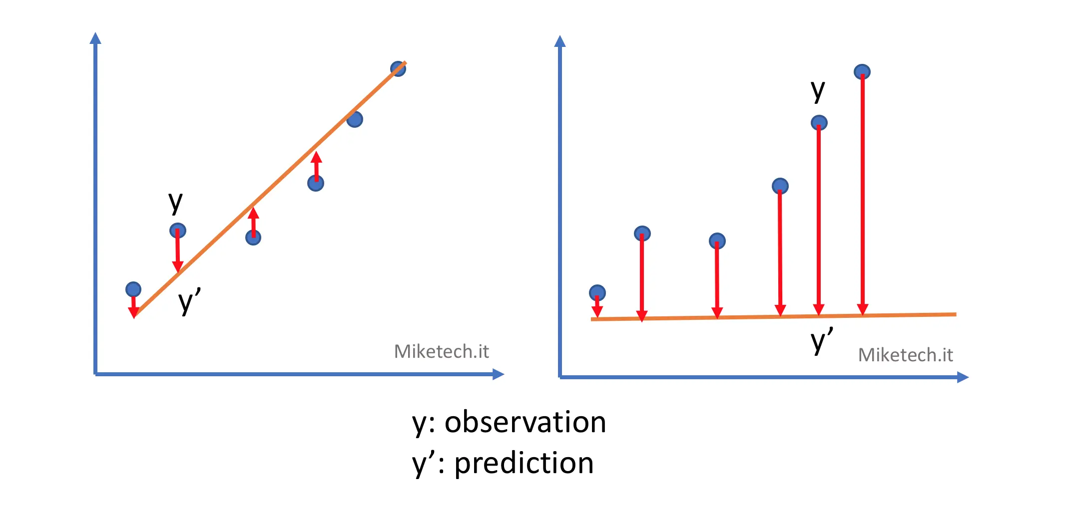 在下图中y点就是原坐标(observation),y‘是预测出来的点(prediction),红色的箭头就是损失(Loss)