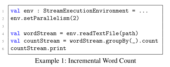 下面的代码示例中显示了如何在 Apache Flink 中实现简单的 Word Count 程序。在此程序中,从文本文件中读取单词,并将每个单词的当前计数打印到标准输出上。这是一个有状态的流处理程序,所以数据源需要知道它们在文件中的当前偏移量,并且需要计数器来将每个单词的当前计数保持在内部状态中。
