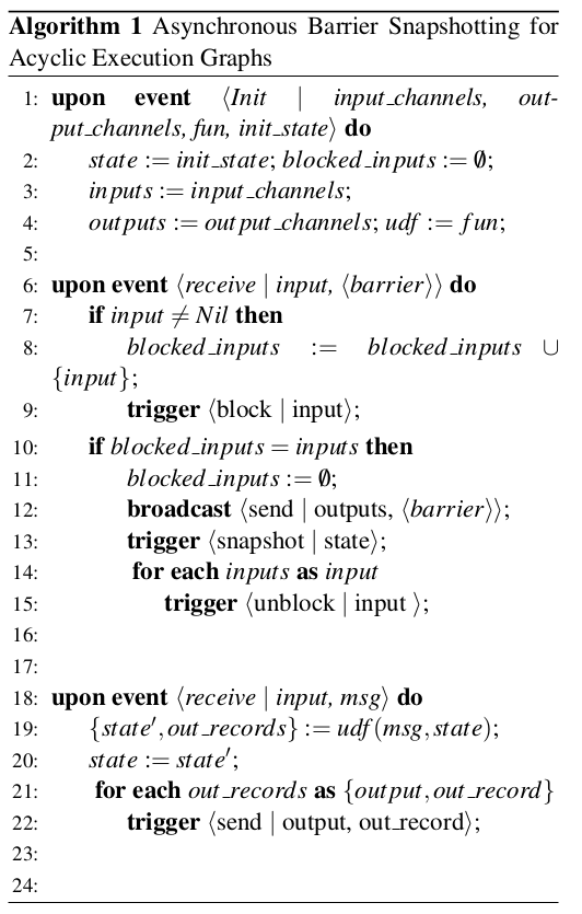 我们的目的是解决在分布式数据流系统上执行定期全局快照的问题。我们引入了 ABS,这是一种新的快照技术,可实现良好的吞吐量。ABS 是第一种考虑非循环执行拓扑的最小可能状态的算法。此外,我们通过仅存储需要在恢复时重新处理的记录来扩展 ABS 以在循环执行图上使用。我们在 Apache Flink 上实现了 ABS,并对比同步快照算法评估了我们算法的性能。在早期阶段,ABS 显示出良好的结果,对整体执行吞吐量影响较小并具有线性可扩展性。