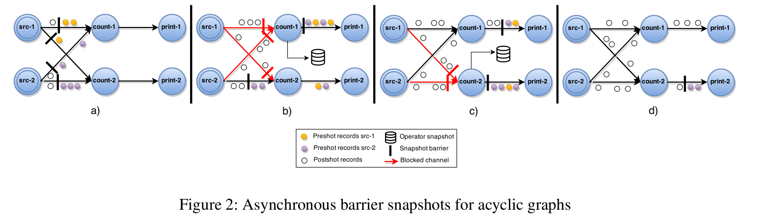对于可行性,足以证明在全局快照中的算子状态仅反映了直到最后阶段处理的记录的历史过程。这可以通过 channels 的 FIFO 顺序特性以及 barrier 全部接收之前阻塞 input channels 保证 stage 的 post-shot 记录不会在快照生成之前处理。