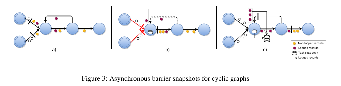 back-edge L。根据控制流图理论,有向图中的 back-edge 是指在深度优先搜索中已经访问过的顶点的边。执行图 G(T,E \ L) 是一个包含拓扑中所有任务的 DAG。从该 DAG 的角度来看,该算法与以前一样运行,但是,我们需要在快照期间对下游 back-edge 接收的记录进行备份。barrier 将循环中的所有记录都推送到下游日志中,以便将它们包含在一致的快照中。