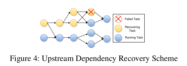 仅通过重新调度上游任务依赖(其包含到失败任务的 output channels)以及它们各自直到 source 的上游任务,重新恢复调度部分图也是可能的。下图显示了一个恢复示例。为了提供 exactly-once 的语义,应该在所有下游节点中忽略重复记录以避免重新计算。为了达到这个目的,我们用来自source 的序列号标记记录,因此,每个下游节点都可以丢弃序号小于他们已经处理的记录。