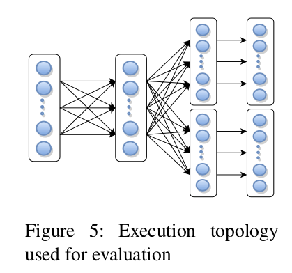 评估的目标是将 ABS 的运行时间开销与 Naiad 中采用的全局同步快照算法进行比较,并测试算法在大数量节点上的可伸缩性。用于评估的执行拓扑结构(如下图)由6个不同的算子组成,其并行度等于集群节点的个数,转换为 6 * 集群大小 个任务顶点。执行包含3个完整的网络 shuffle,以突显 ABS 中通道阻塞的可能影响。source 产生总共10亿条记录,这些记录在