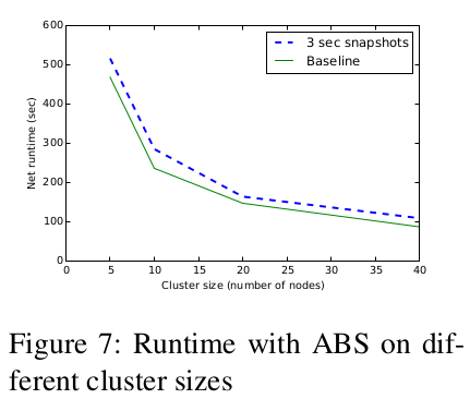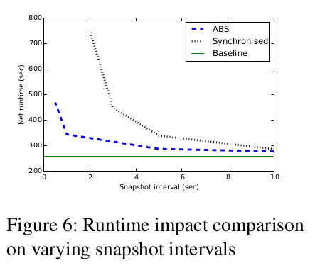 我们测量了在不同快照间隔下 ABS 和同步快照两种快照方案运行的运行时间开销。我们实现了在 Apache Flink Naiad 上使用的同步快照算法,以便在相同终端上执行进行比较。该实验在10节点集群上运行。为了评估我们算法的可伸缩性,我们处理固定数量的输入记录(10亿),同时将我们拓扑的并行度从5个增加到40个节点。