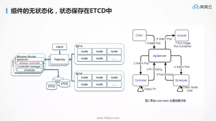 如图黑色的部分是 Kubernetes 原生的部分,而蓝色的部分是网易云为了支撑大规模高并发应用而做的定制化部分。