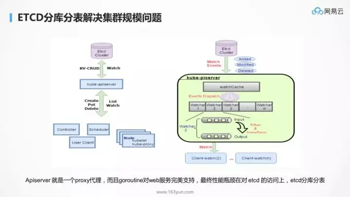 API-Server 作为接入层,是有自己的缓存机制的,防止所有的请求压力直接到后端数据库上。但是当仍然无法承载高并发请求时,瓶颈依然在后端的 etcd 存储上,这和电商应用一摸一样。当然能够想到的方式也是对 etcd 进行分库分表,不同的租户保存在不同的 etcd 集群中。