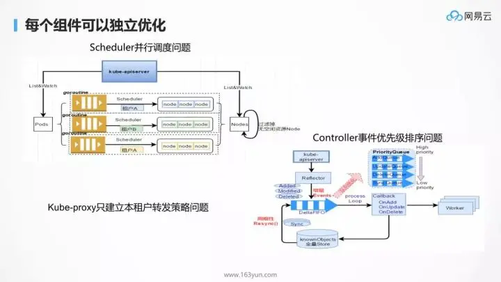 为了解决超过 3 万个节点的规模问题,网易云需要对各个模块进行优化,由于每个子模块仅仅完成自己的功能,Scheduler 只管调度,Proxy 只管转发,而非耦合在一起,因而每个组件都可以进行独立的优化,这符合微服务中的独立功能,独立优化,互不影响。而且 Kubernetes 的所有组件都是 Go 开发的,更加容易一些。所以 Kubernetes 上手慢,但是一旦需要定制化,会发现更加容易。